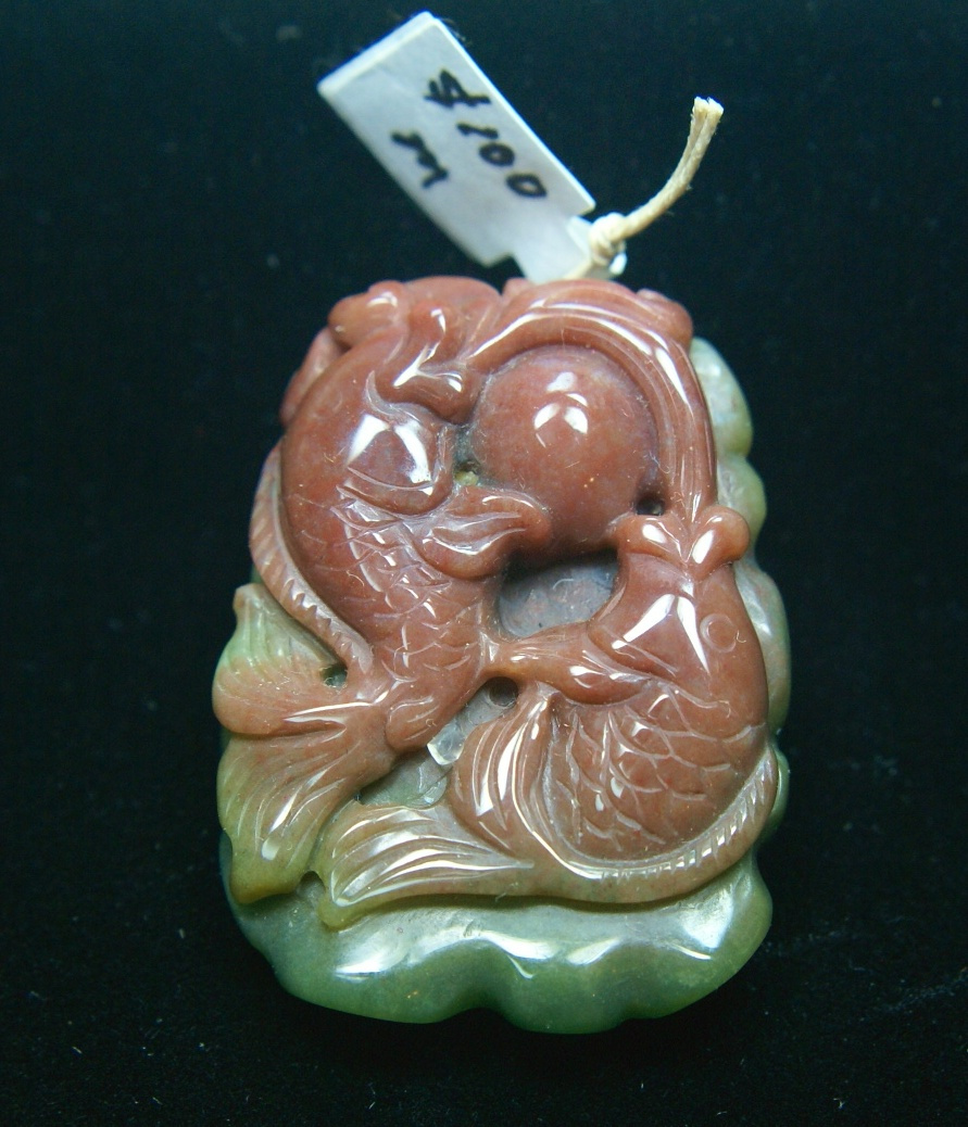 Item #DB10, Price $100.00 length 43mm, 33mm width, thickness 15mm at the top. Carved fancy jasper cut from one stone. It can be used as a pendant since it has a hole drilled in the top or added to your collection of fine carvings. The top side of the bead is carved in the maroon part of this stone. The back side is carved in the green part of this stone. Top side has carved fish shown in photo. Back side has carved lotus leaf.    (02/33)