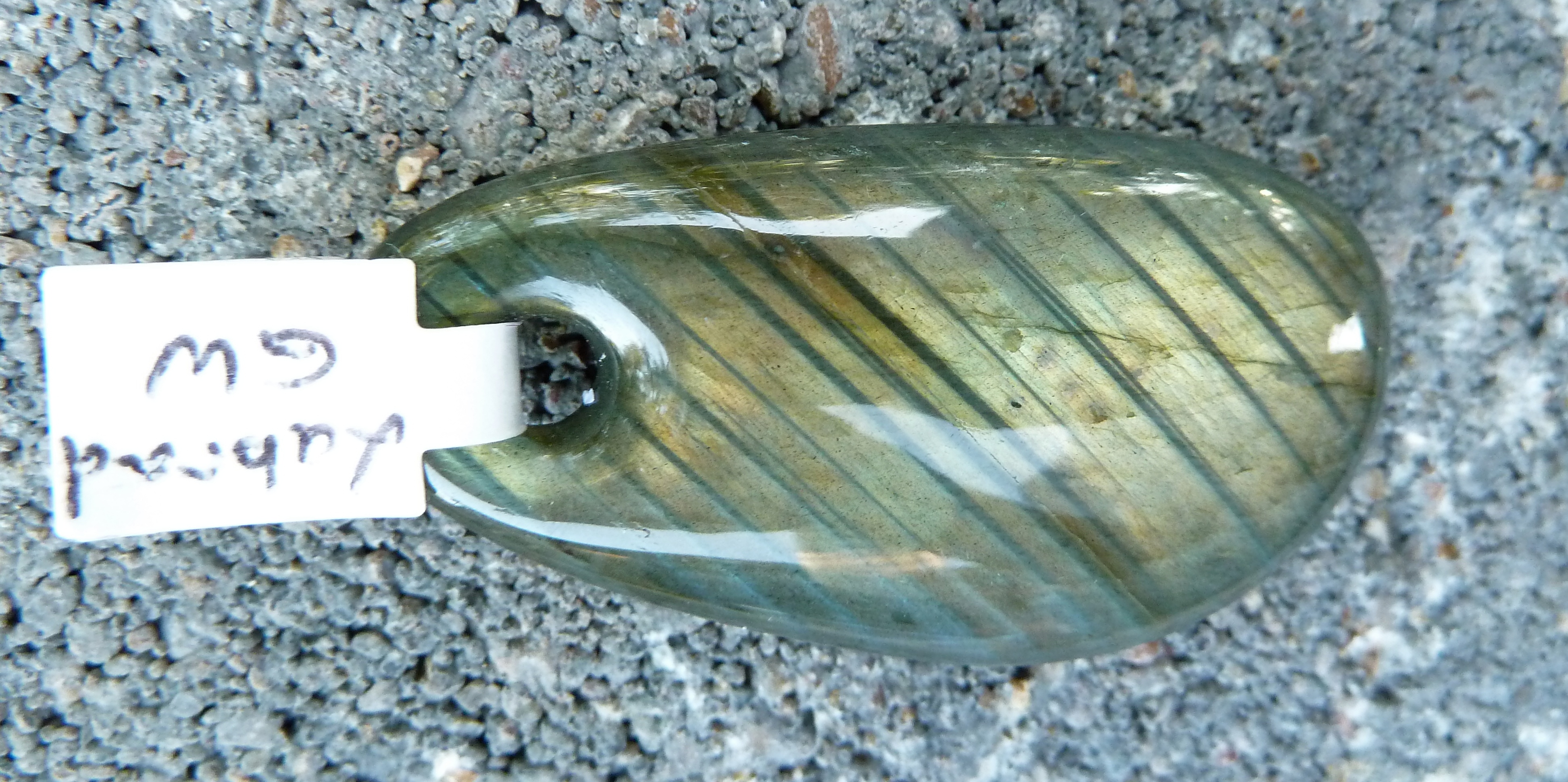 Item #DB11, Price $55.00 Handcut designer Labradorite pendant. Beautiful yellow chatoyance to this stone. Length is almost 2" by alomost 1" wide. All this stone needs is a bail or leather strand to make a beautiful necklace.    (03/33)