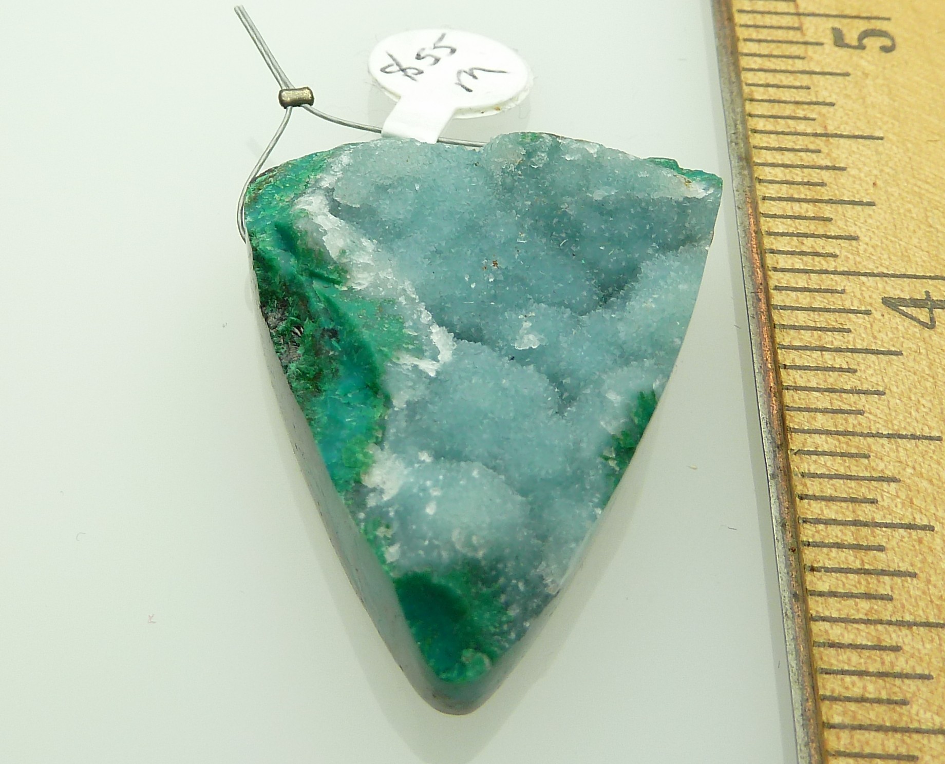 Scaled image P1010791.JPG: Item #Chryso2, Price $55.00 Handcut designer Chrysocolla and druzy quartz pendant bead. The druzy is a natural coating on top of the malalchite and chrysocolla. All sides except the top are polished. Bead is 37mm long by 31 mm wide at the top. Bead is drilled through the widest part of the stone. Drill hole size is about 2.5 mm. All this stone needs is a bail or leather strand to make a beautiful pendant. �