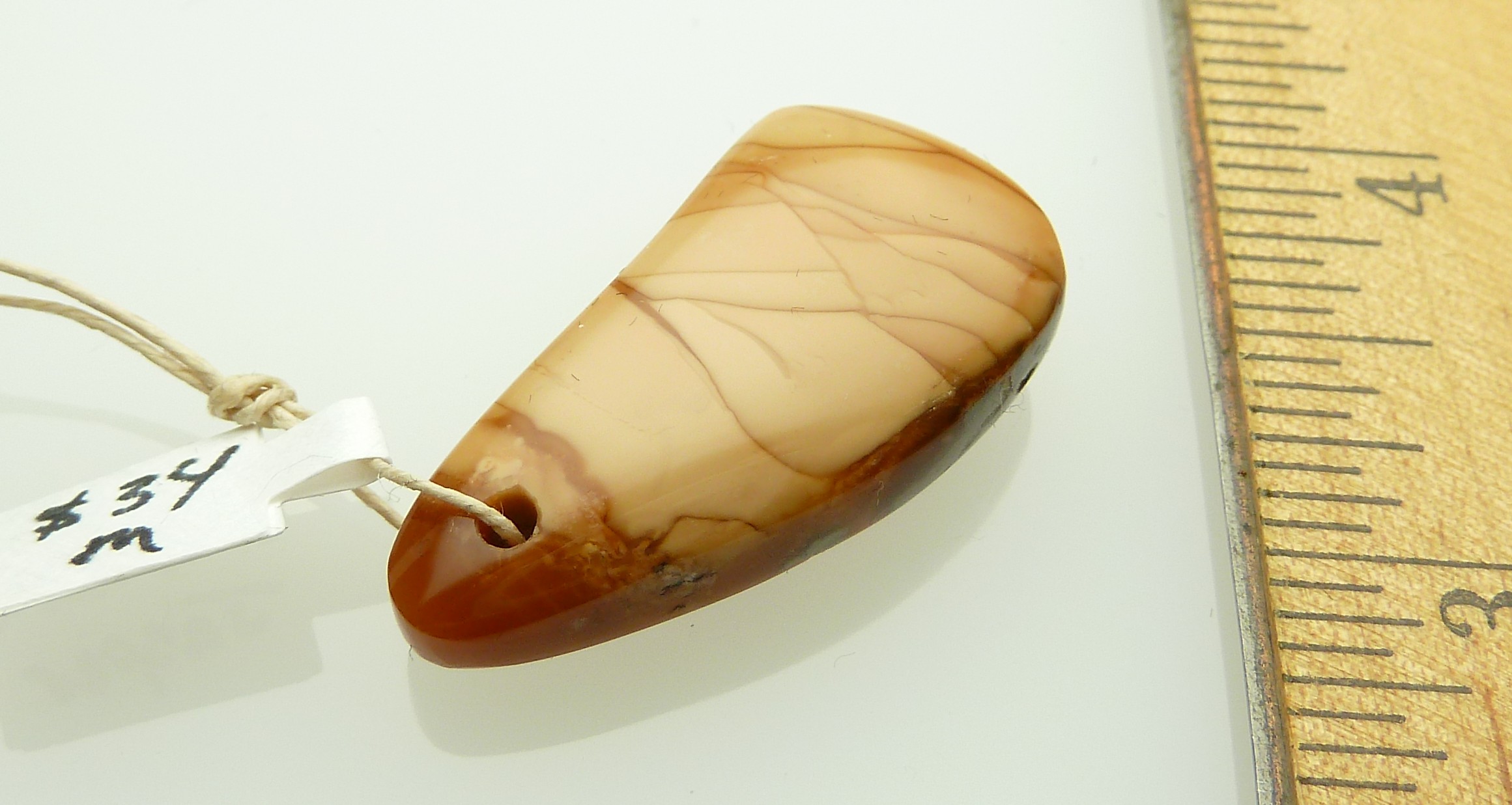 Scaled image P1010808.JPG: Item #Bruno2, Price $34.00 Bruneau Jasper pendant. Hand cut Bruneau jasper. Can be worn with either side showing. Bead is 35mm long by 18 mm wide at the base. Drill hole size is about 2.0 mm. All this stone needs is a bail or leather strand to make a beautiful pendant.�