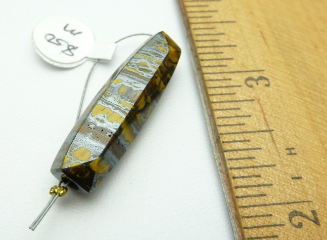 Item #TigerIron1, Price $50.00 Tiger Iron, hematite and golden tiger eye, six sided bead. Drilled through long axis. Bead is darker than the photo. Bead is 32 mm long by 9 mm wide. Drill hole size is about 3.0 mm.    (10/33)