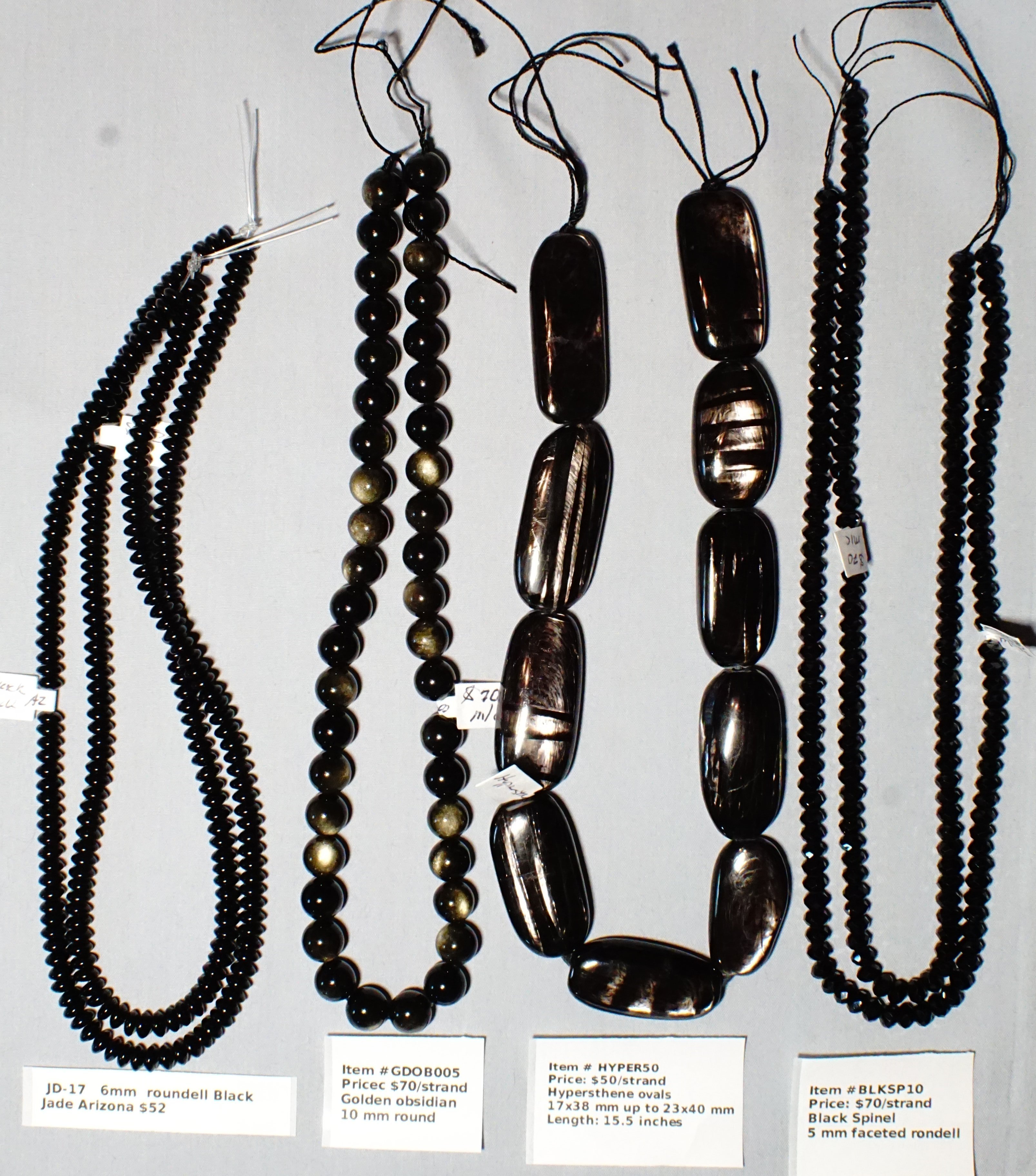 Item # JD-17 6mm Black Jade Item # GDOB005 - 10 mm golden obsidian $70/strand Item # HYPER50-Hypersthene ovals Item # BLKSP10 - 5 mm Balck spinel $70/strand   (02/36)