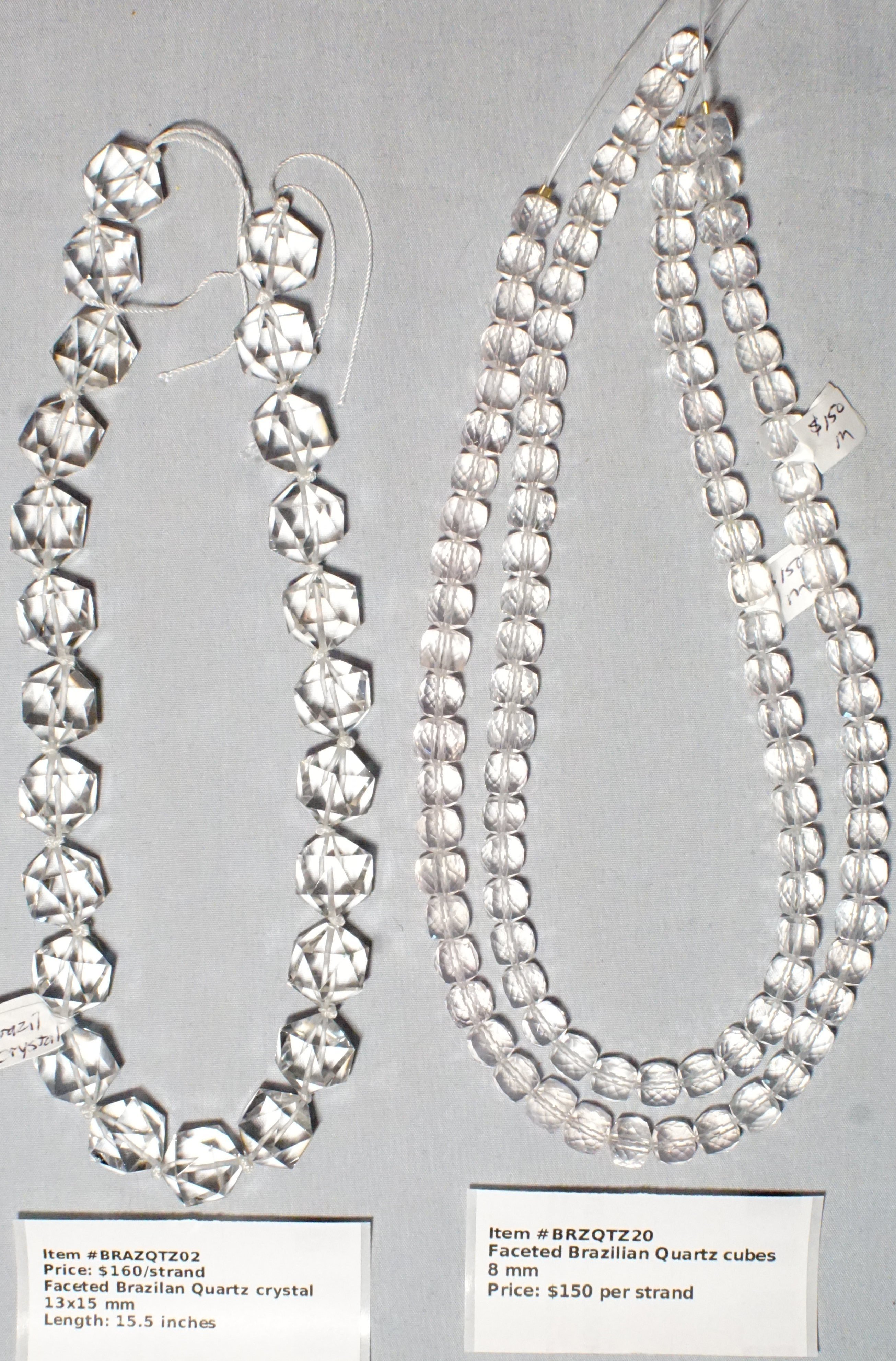 Item # BRAZQTZ02 - Brazilian Quartz, 13x15 mm faceted, $160/strand Item # BRZQTZ20 - Brazilian Quartz, 8 mm faceted cubes, $ 150/strand   (03/36)