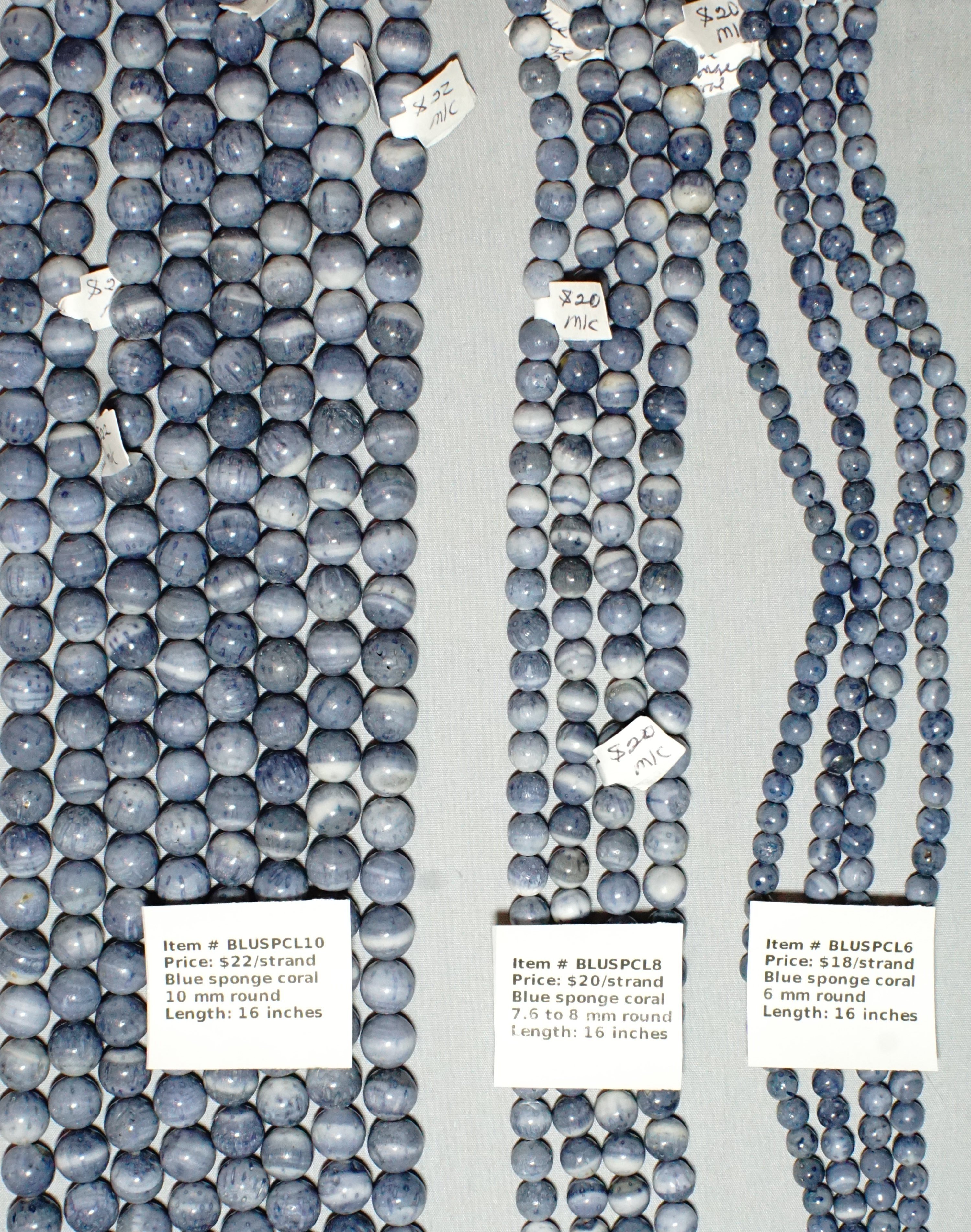 Item # BLUSPCL10 - Blue sponge coral, 10 mm round, $22/strand Item # BLUSPCL8- Blue sponge coral, 7.6 to 8 mm, $20/strand Item # BlUESPCL6 - Blue Sponge coral, 6 mm, $18/strand   (04/36)