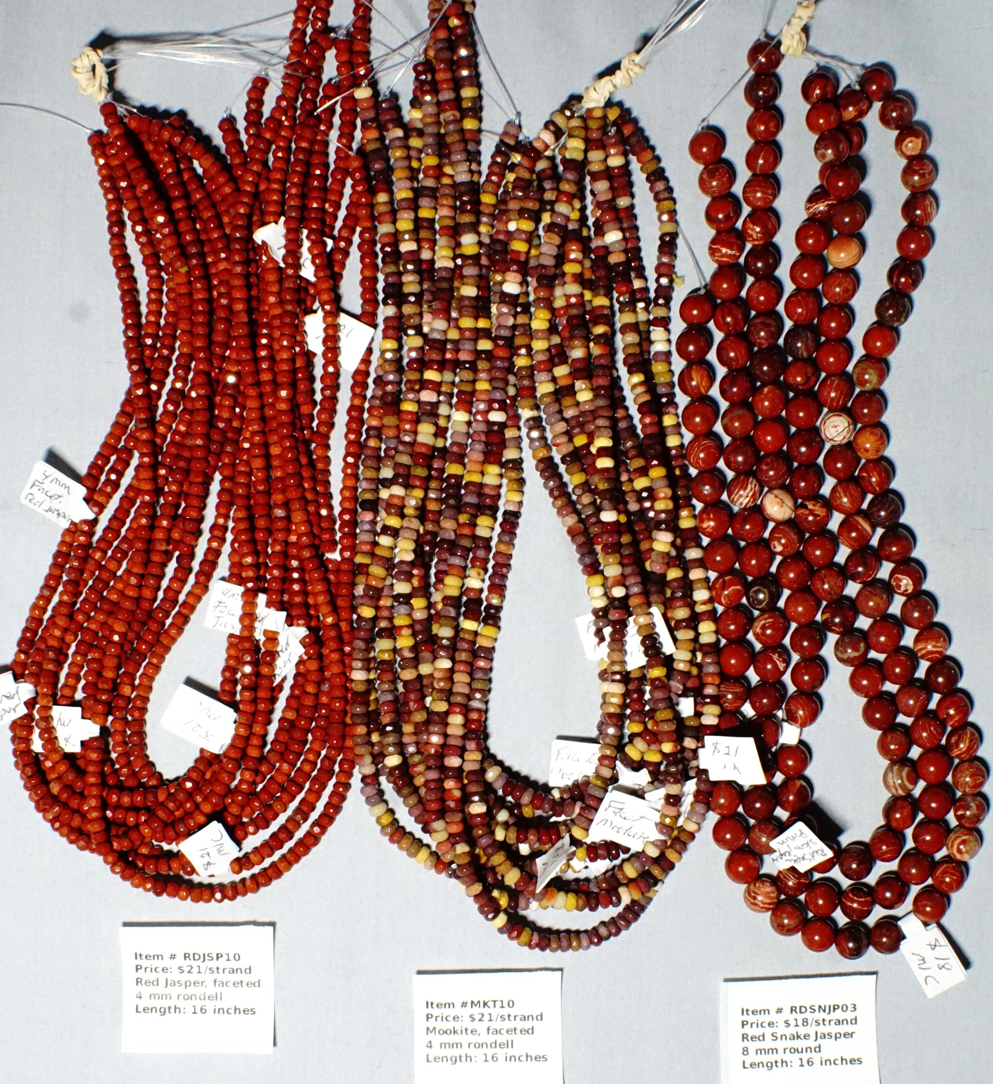 Item # RDJSP10 - Red jasper faceted rondells, 4 mm, $21/strand Item # MKT10-Mookitem faceted rondell, 4 mm, $21/strand Item # RDSNJP03-Red Snake Jaspeh, 8 mm round, $18 / strand   (18/36)