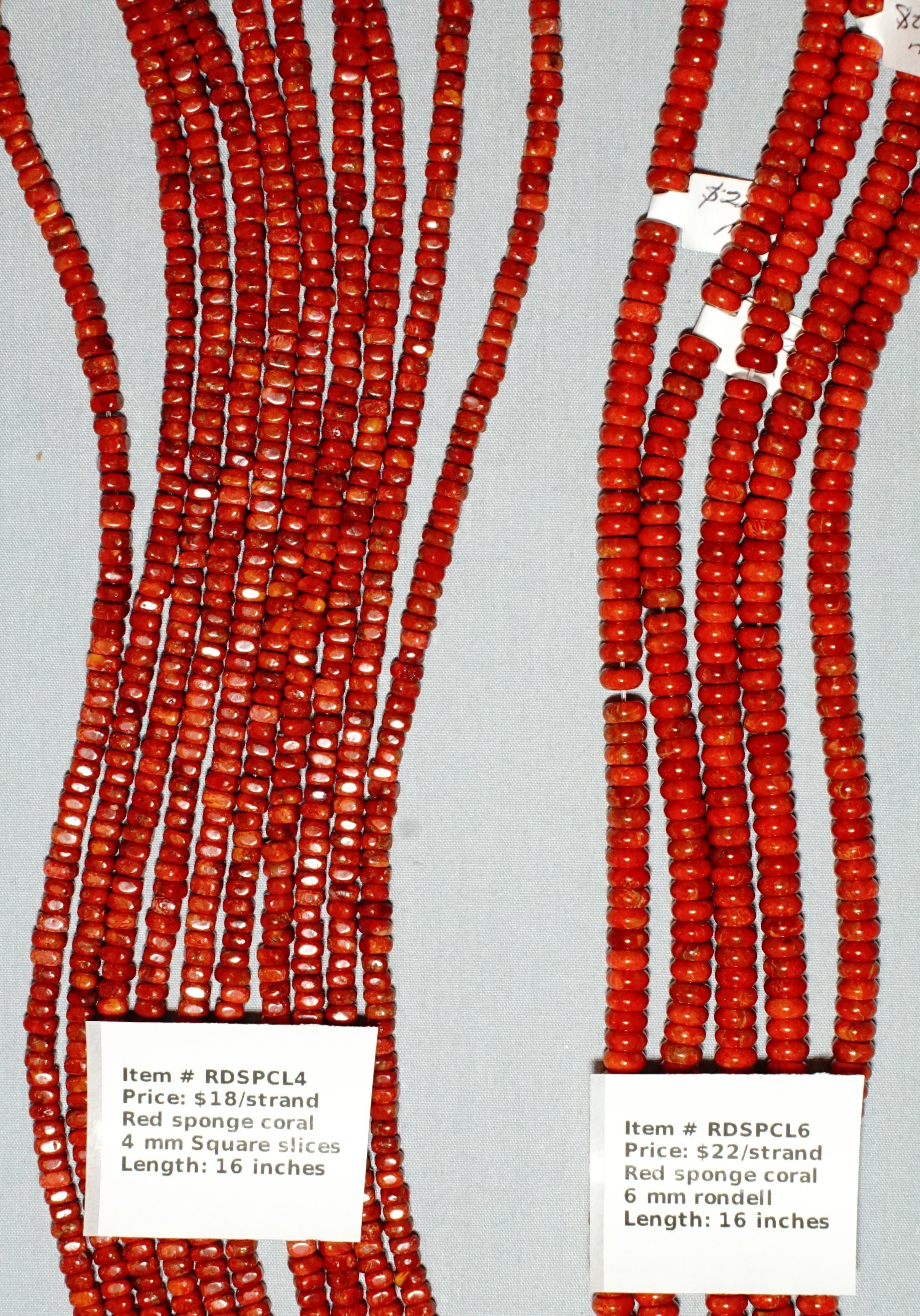 Item # RDSPCL4-Red Sponge Coral, 4 mm square, $18/strand Item # RDSPCL6-Red Sponge Coral, 6 mm rondell, $ 22/strand   (26/36)