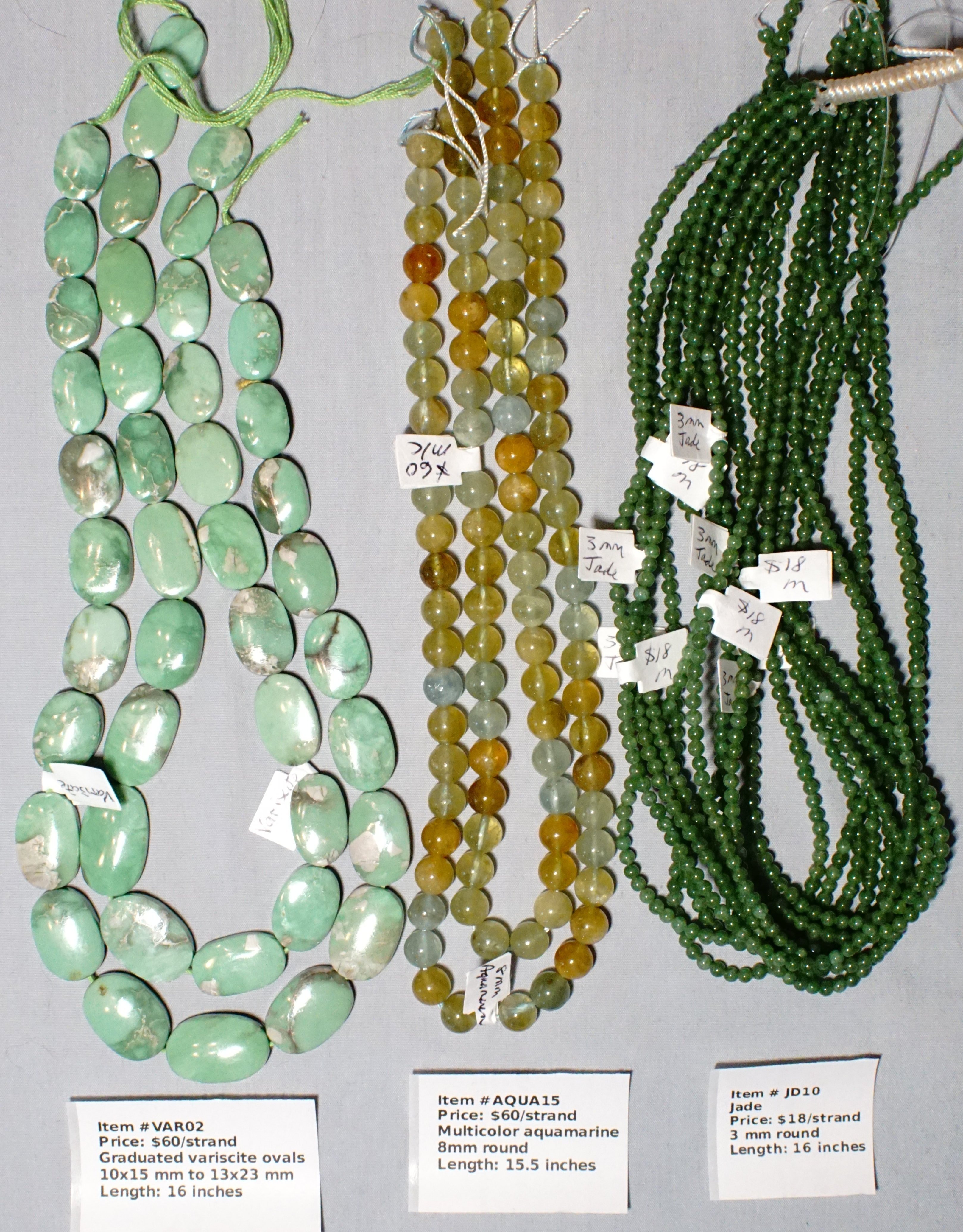 Item # VAR02-Graduated variscite ovals, 10x15 mm to 13x 23 mm, $60/strand Item # AQUA15-Multicolor Aquamarine, 8 mm, $60/strand Item # JD10-3mm round jade, $18/strand   (35/36)