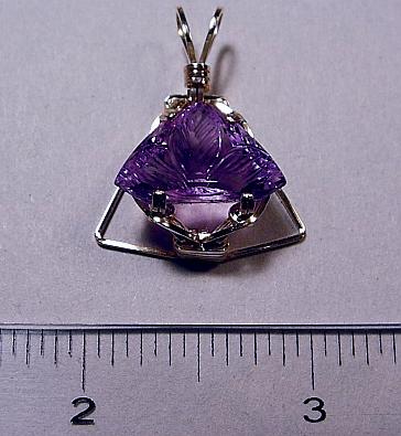 Scaled image 12010059.jpg: Item # AM1 Price $75.00 Fancy cut faceted Amethyst with cut leaves on the back of the stone and hand wire wrapped in 14 kt gold filled wire. �