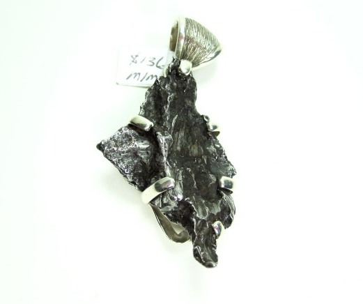 Item #MTR2 Price $136.00. Wonderful meteorite pendant! Pendant bail can handle up to about a 7 mm chain. Size 60 mm long by 30mm wide at the widest point of the meteorite. Set in sterling silver.    (07/33)