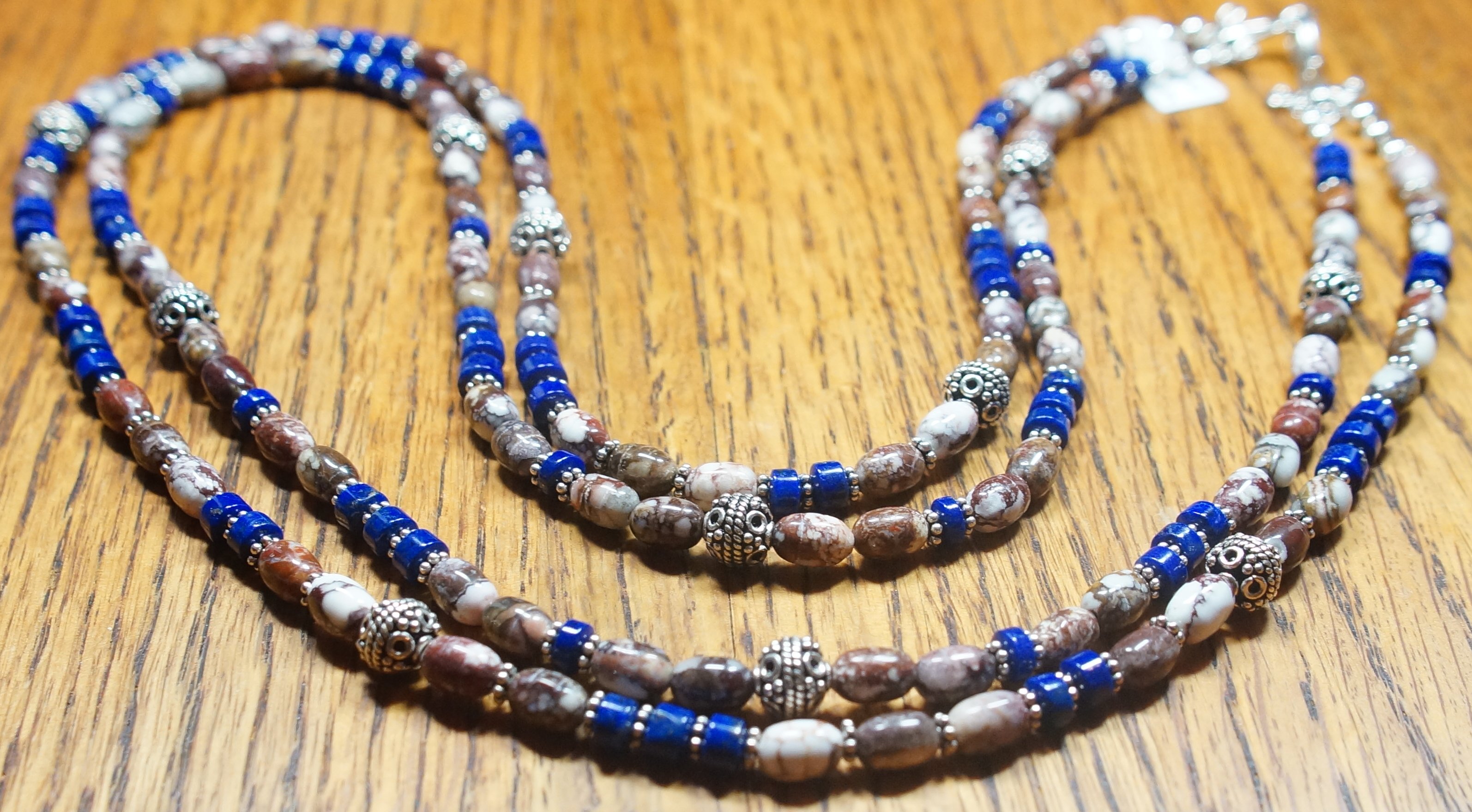 Scaled image Lapis and Wild Horse.JPG: Item #20151214b. $295. Wild Horse Oval Barrels, Lapis Rondells, Sterling Silver Bali Beads, Findings and Clasp. Double Strand Necklace. 26/27 inches long.�