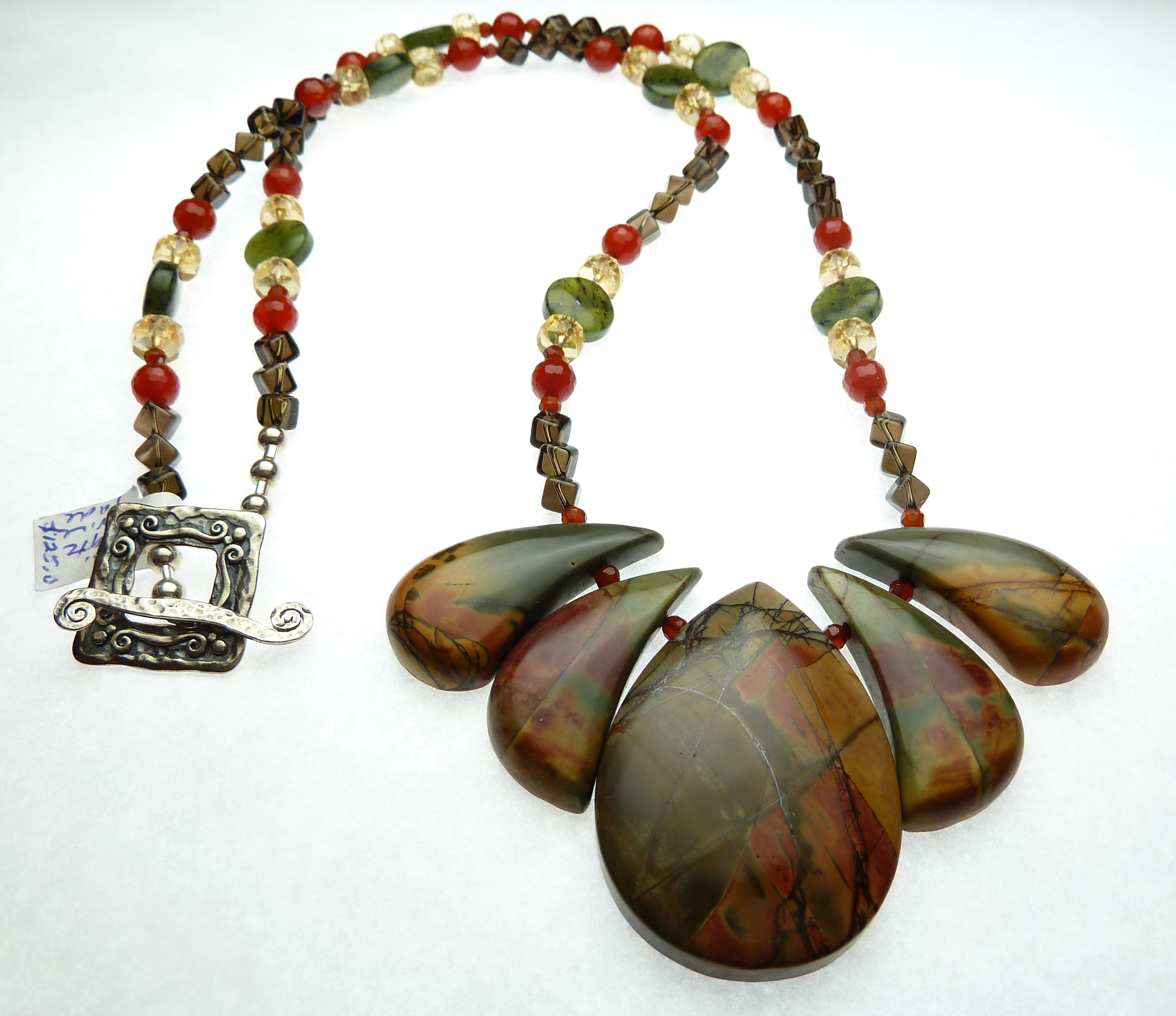 Red Creek Jasper, Smoky Quartz, Carnelian, Agate, and Canadian Jade with Sterling Silver findings and clasp.   (26/33)