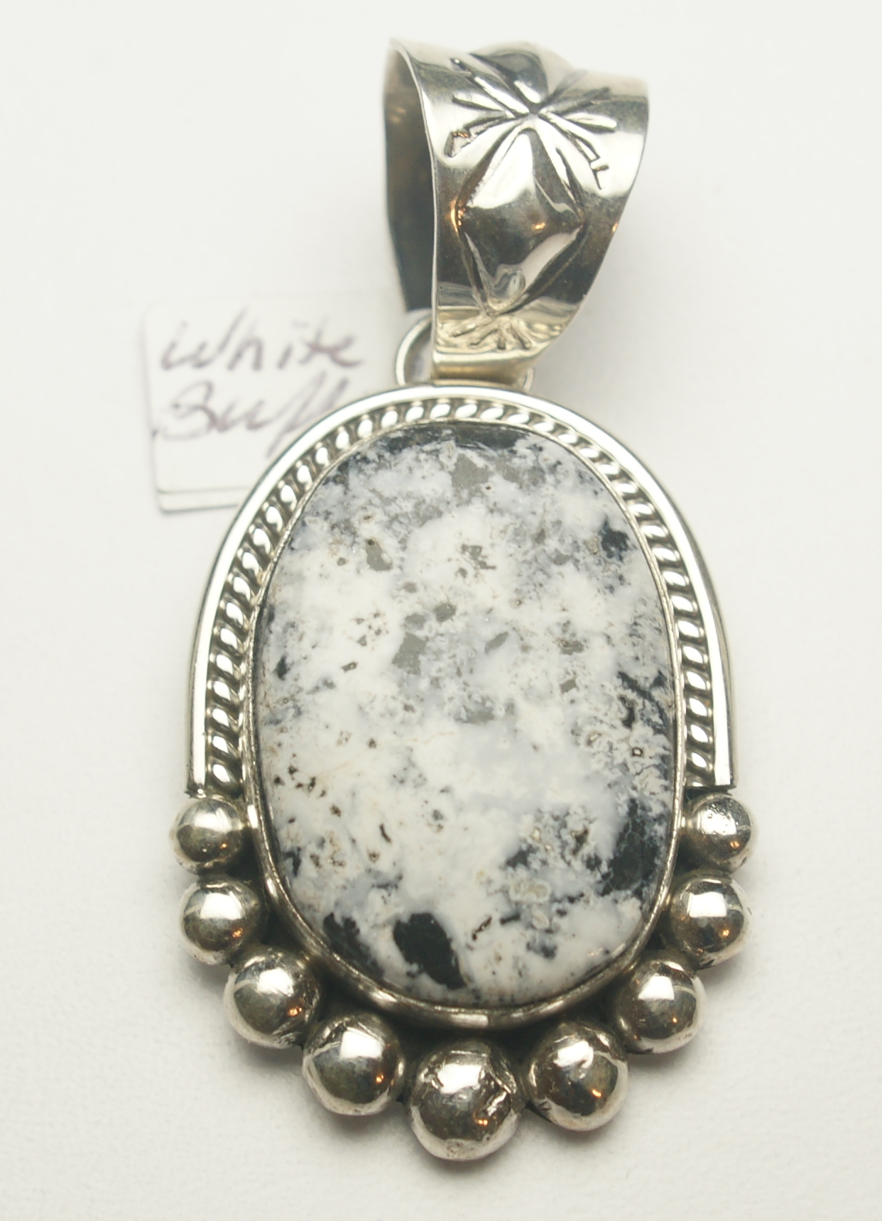 Item # 201598, $350. Native American White Buffalo pendant made by Mary Ann Spencer. Sterling Silver. Length 2.25 by 1" width.    (32/33)